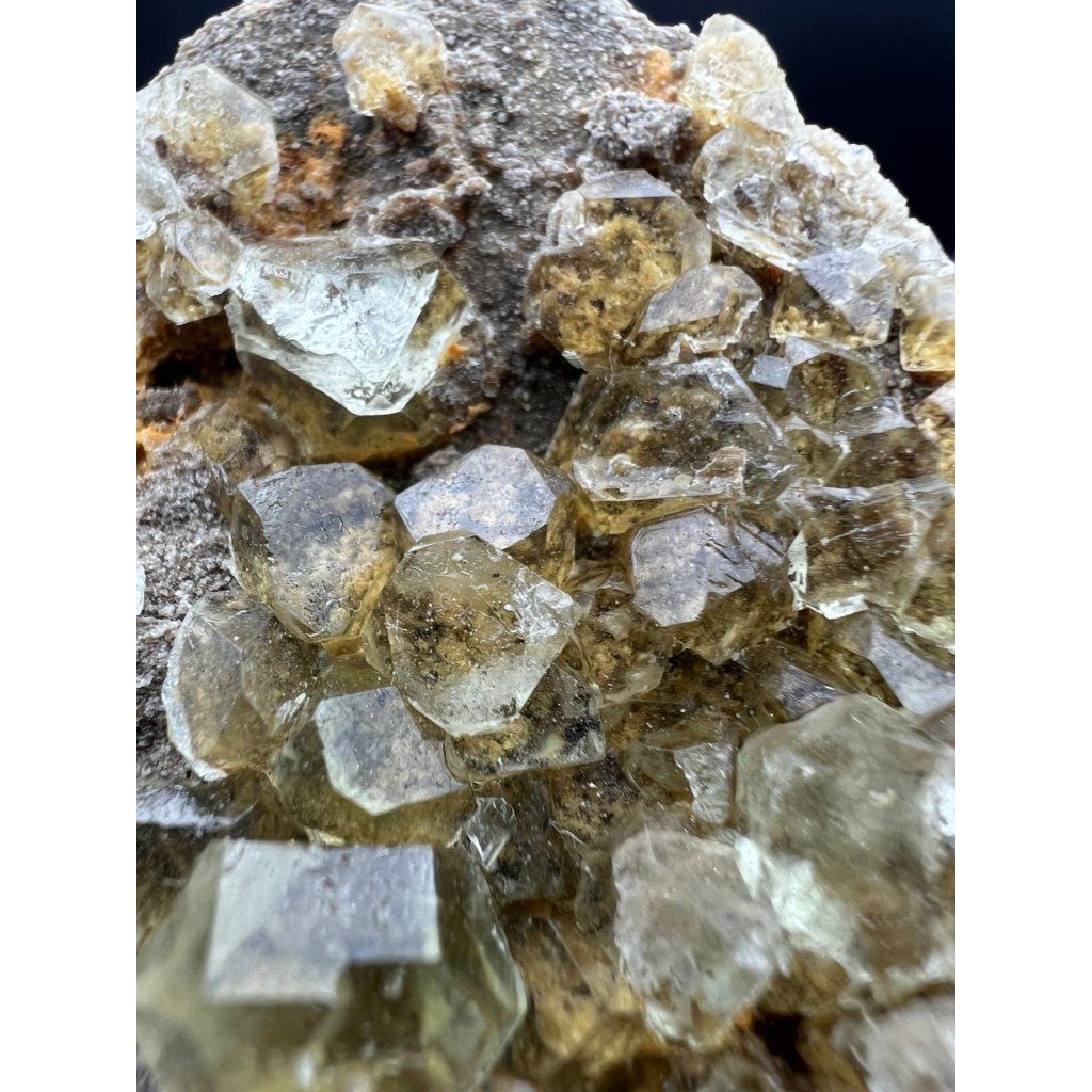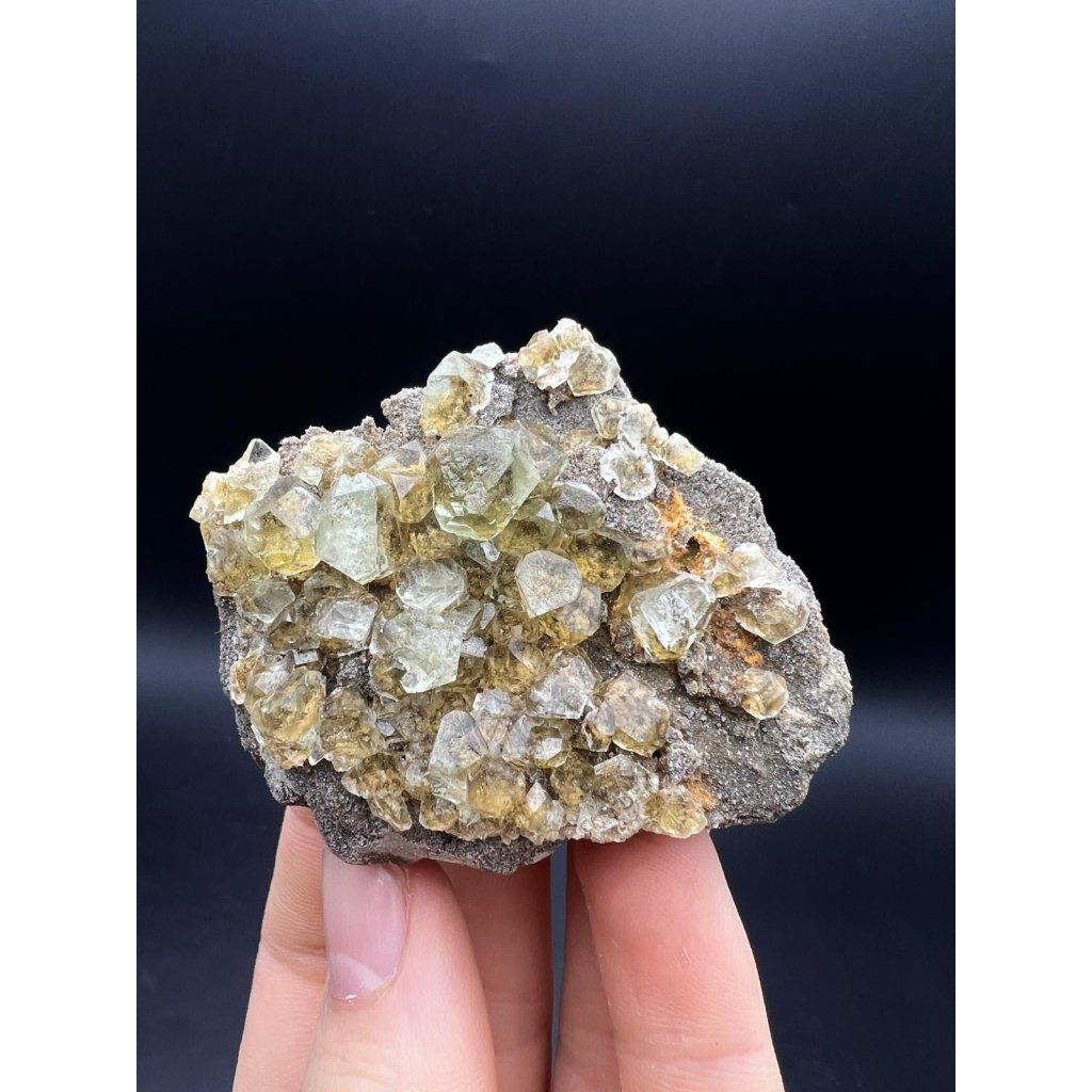 Krystaly fluoritu mají přirozený lesk a světle zelenou barvu. Vzorek je nepoškozen. Dá se vystavit bez podstavce.
