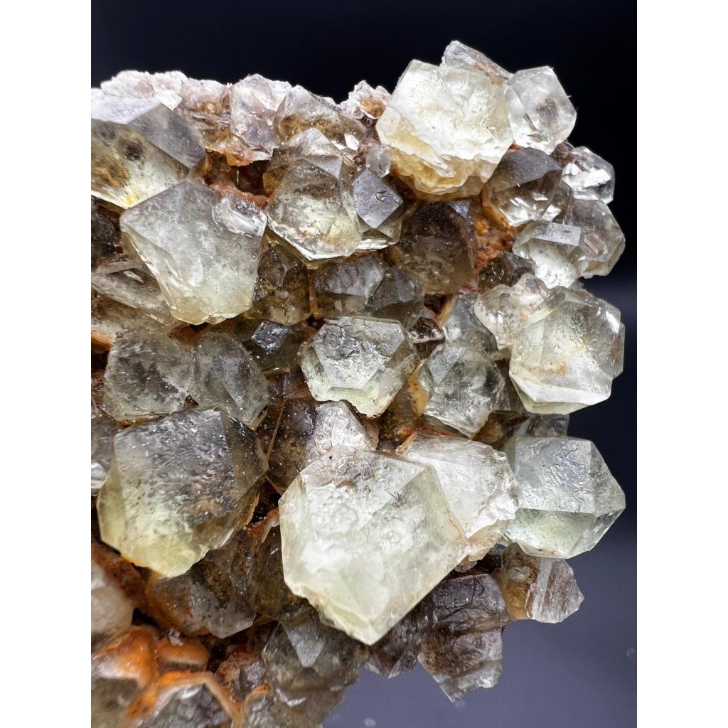 Krystaly fluoritu mají přirozený lesk a světle zelenou barvu. Vzorek je nepoškozen.