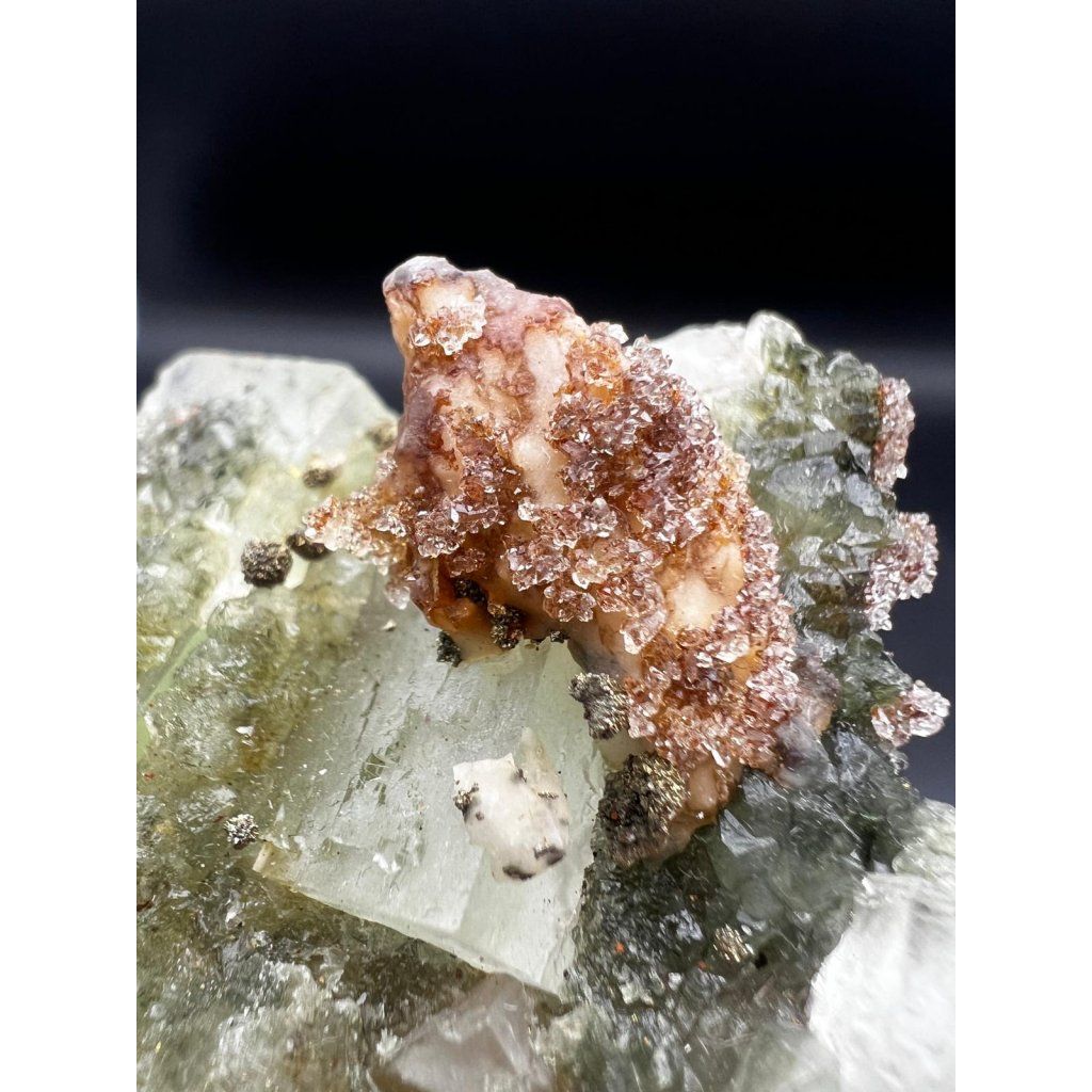 Základ tvoří světle zelené krystaly fluoritu s přirozeným leskem. Na jejich povrchu a v jejich asociaci narůstají krystaly pyritu, kalcitu a křemene.