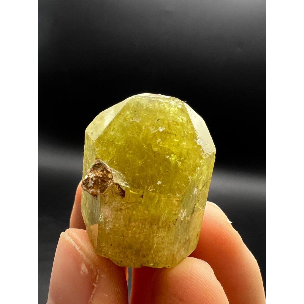 Krystal fluoroapatitu má přirozený lesk, žlutozelenou barvu a jedná se o samostatný krystal bez mateční horniny.