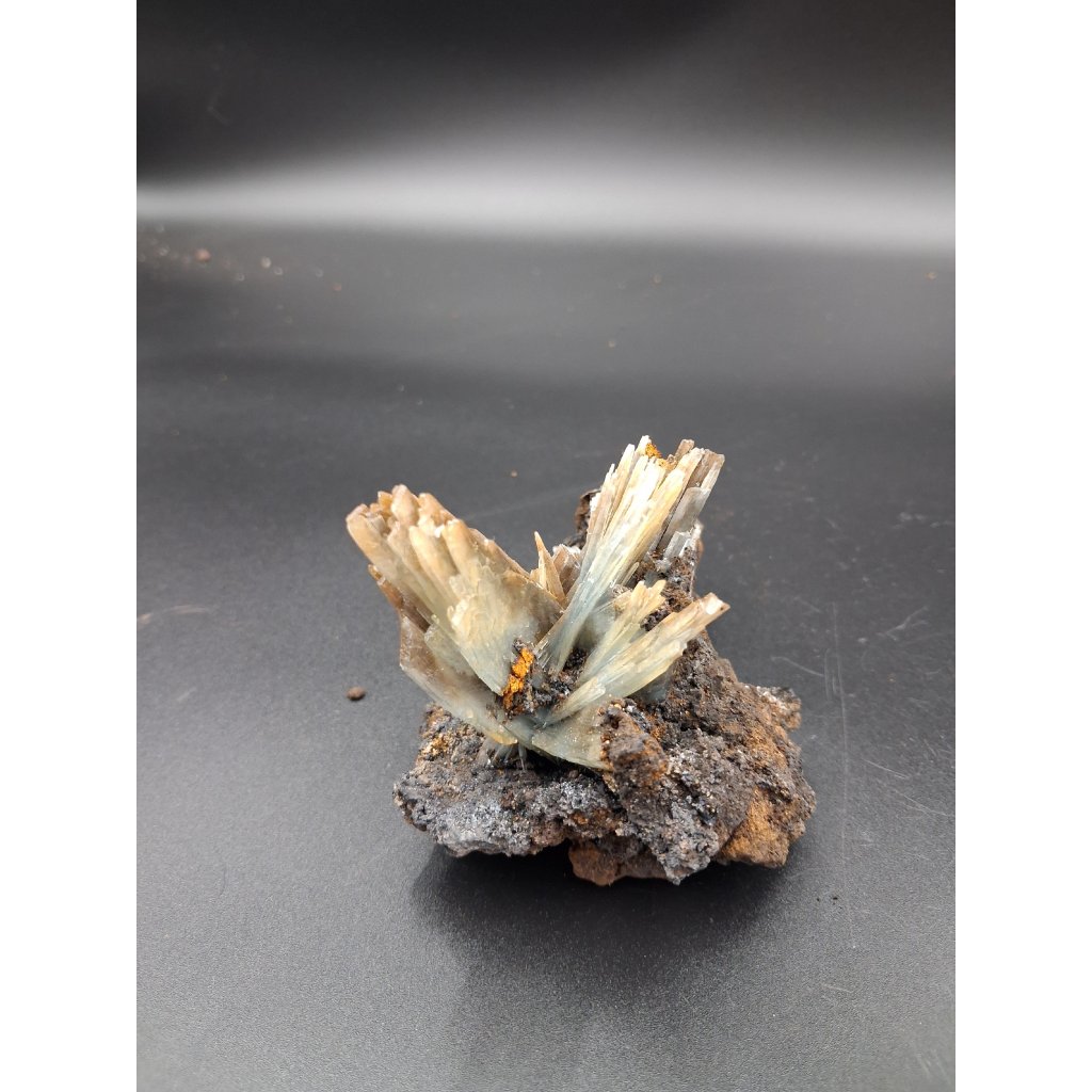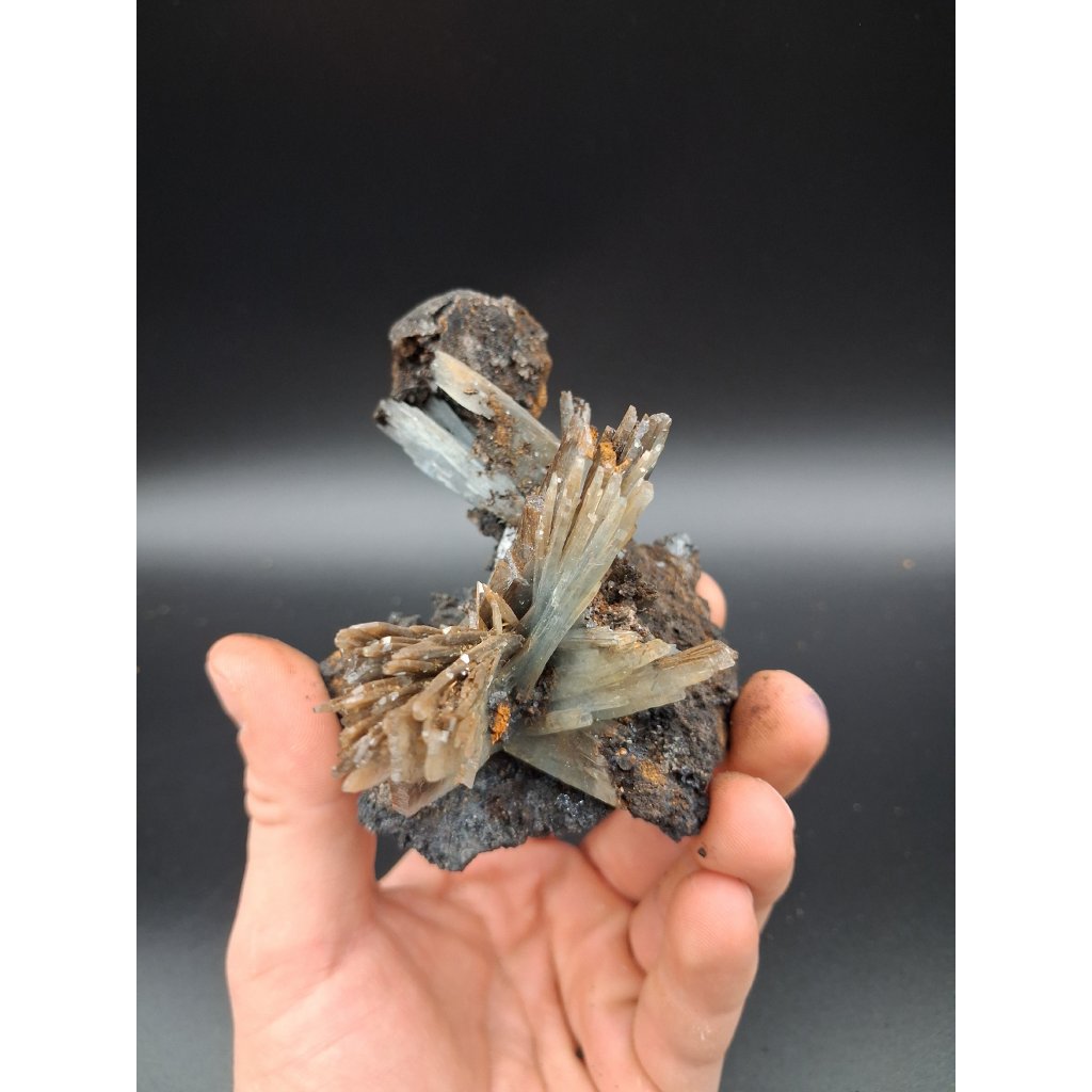 Modrý baryt z oblasti Jebel Ouchaine v Maroku je atraktivní přírodní minerál známý svou jemnou modrou barvou, tabulkovitou krystalickou strukturou a skelným až perleťovým leskem. Tento esteticky výrazný minerál vznikal postupnou krystalizací v hydrotermálních žilách, díky čemuž má každý exemplář jedinečný tvar, kresbu i intenzitu zbarvení. Velikost je přibližně 6 na 5 cm.