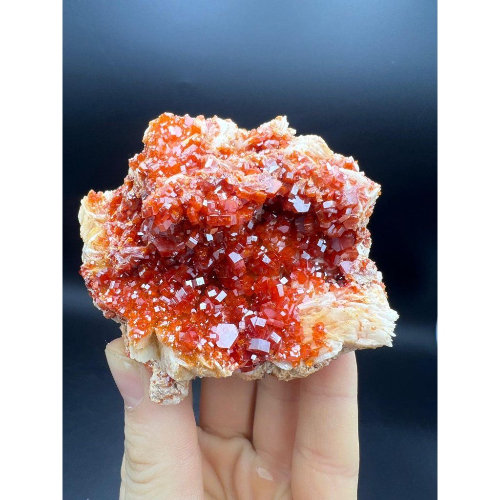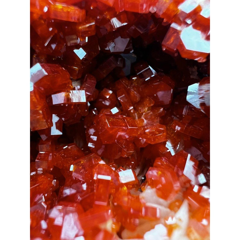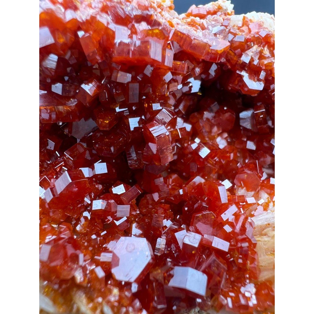Krystaly vanadinitu mají perfektní lesk, svítivě červenou barvu a jsou asociaci s barytem.