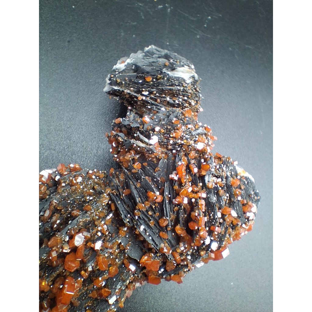 Vanadinit s barytem a goethitem z oblasti Mibladen v Maroku představuje výraznou minerální asociaci typickou pro oxidační zóny olověných rudních ložisek. Sytě červené hexagonální krystaly vanadinitu zde kontrastují se světlou barytovou matricí a tmavšími zemitými strukturami goethitu, čímž vzniká esteticky velmi atraktivní a sběratelsky ceněný exemplář. Velikost je cca 8 na 8 cm.