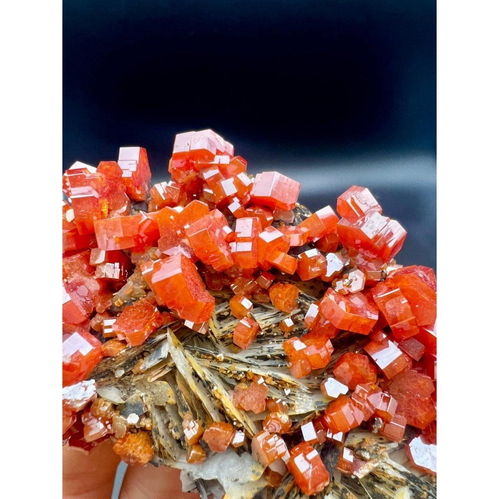 Na vzorku jsou zřetelně viditelné sytě červené, hexagonální krystaly vanadinitu, které narůstají na podklad tvořený tabulkovitým barytem a vrstvami goethitu. Jedná se o čistě přírodní, neupravovaný kámen s přirozeným prostorovým uspořádáním krystalů.